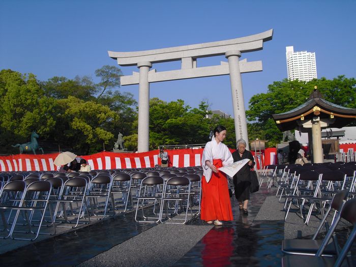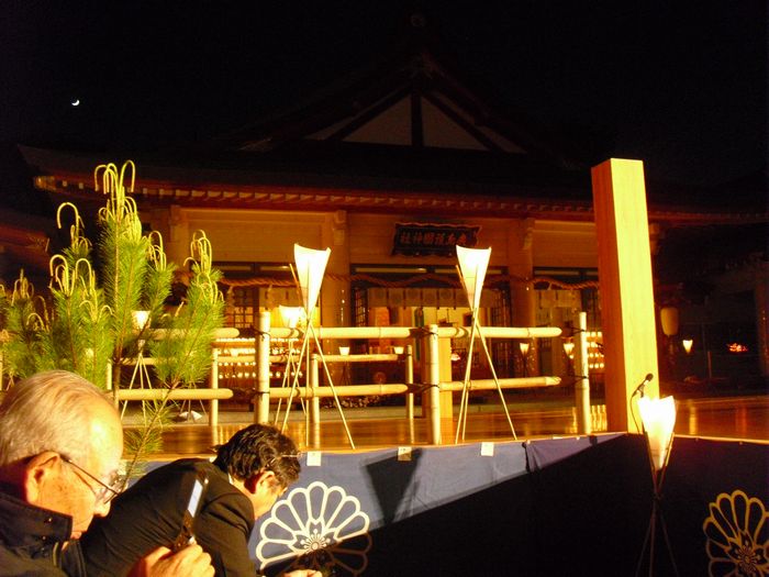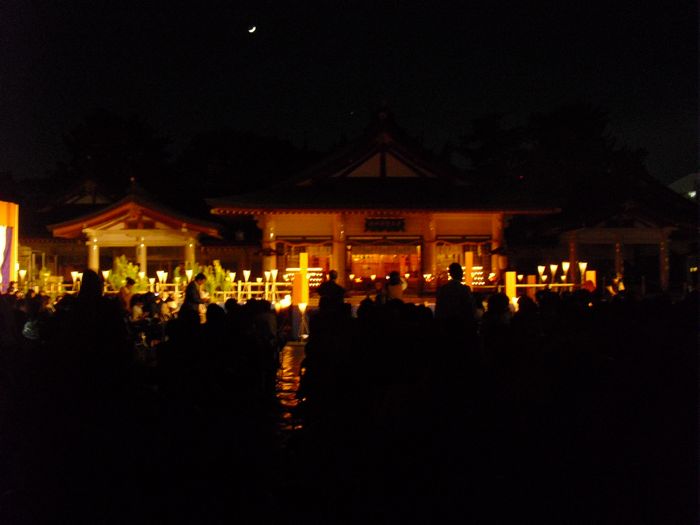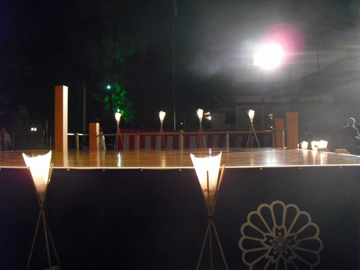 先週の日曜日の夕方からは、ご飯も食べずに2本のライブをはしご。翌日の月曜日の夜は、護国神社で行なわれた蝋燭薪能へ。この能舞台にあの野村萬斎が立つということだったので半年前から楽しみにしていました。さすがに誰しもが知っている有名人が来るということで大盛況でした。正面席の前列には広島の財界の面々が見えましたが、ラーPMとあっちゃんは脇正面の最前列に席を構え能と狂言を堪能いたしました。