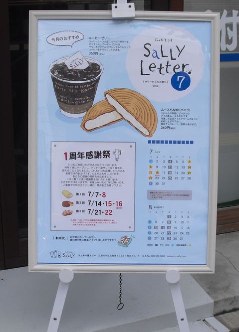 さて、後半開始の今日7月1日(日)は、二女ちはるの洋菓子店「クッキー屋サリー」のオープン記念日。無事1周年を迎えることができました。こちらに対しても多くのお友だちに助けていただき、またTV・ラジオ・タウン誌等マスコミ関係にも扱って頂き感謝いたしております。ほんの2日前にもFM放送の電話突撃取材もしていただき、電波に乗ったようです。本当にありがたいことです。