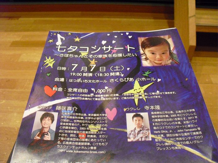 そのような異常事態がありながらも、昨夜はラーPMの仕事場のすぐ前にある廿日市市の「さくらぴあ」でのコンサートをあっちゃんと観てきました。今年、あっちゃんが企画しコンサートを行なったウクレレ奏者寺本隆さんが出演されるとの事で、以前から楽しみにしていました。