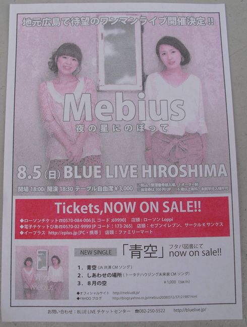 ところで、コンサートといえば来月8月5日(日)にわたしたちが応援している「Mebius」のワンマン・ライブコンサートが開催されます。場所は宇品にある「ブルーライブ広島」にて。お時間のある方は是非お越しください。お時間だけでいいです、ラーPMがコンサートにご招待してもいいですから・・・まぁ10名様くらいでした何とかいたしますので。それ以上だと破産しますから。(笑)ご遠慮なくラーPMかあっちゃんにお問い合わせくださいませ~~。楽しくてとても心温かいライブになること請け合いです。どうかよろしく~~!