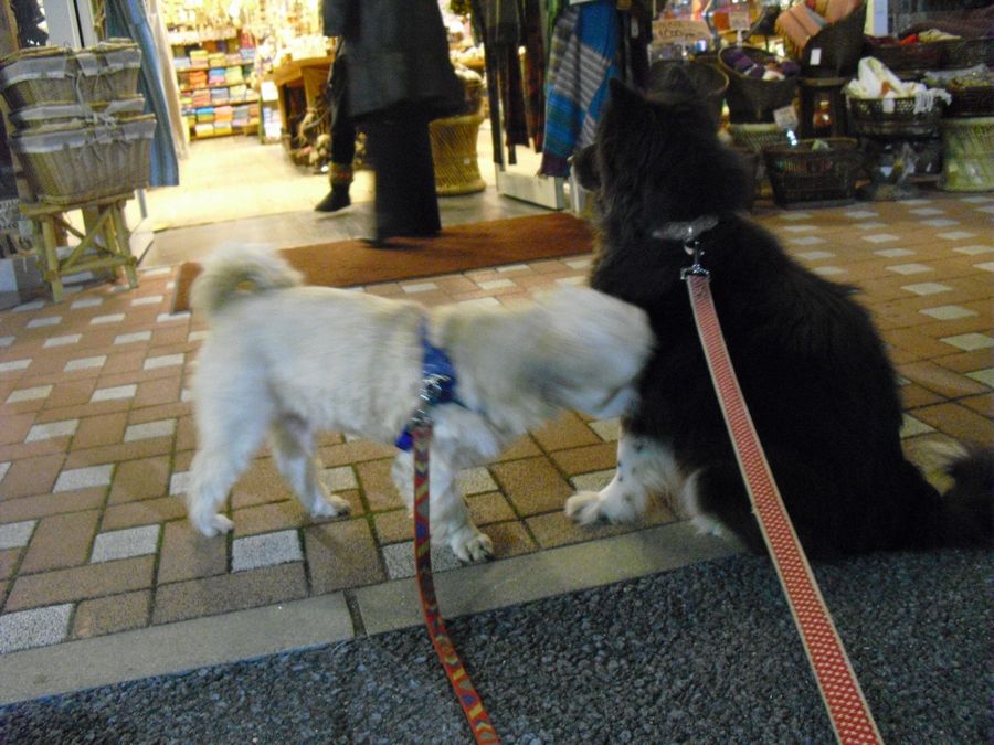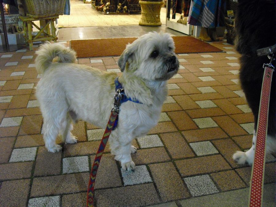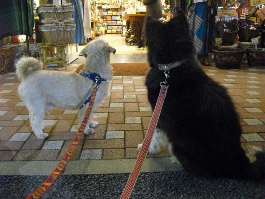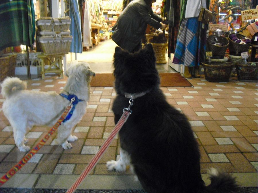 そんなマリーナホップでも、1つだけ私たちのお気に入りのお店がある。民族雑貨のお店、「マライカ」というお店。ここでは時々買い物を楽しませていただいている。昨夜ここに立ち寄ったあっちゃん。外で待たされるラーPMとミッキーとラー。ラーとラーPMは散歩に歩を進めようとするのだけど、ミッキーだけは頑としてお店の前を動こうとしない。「ママがここにいる。残しては行けない!」と。仕方なく私たちもお付き合い。そういうミッキーがとても可愛い。