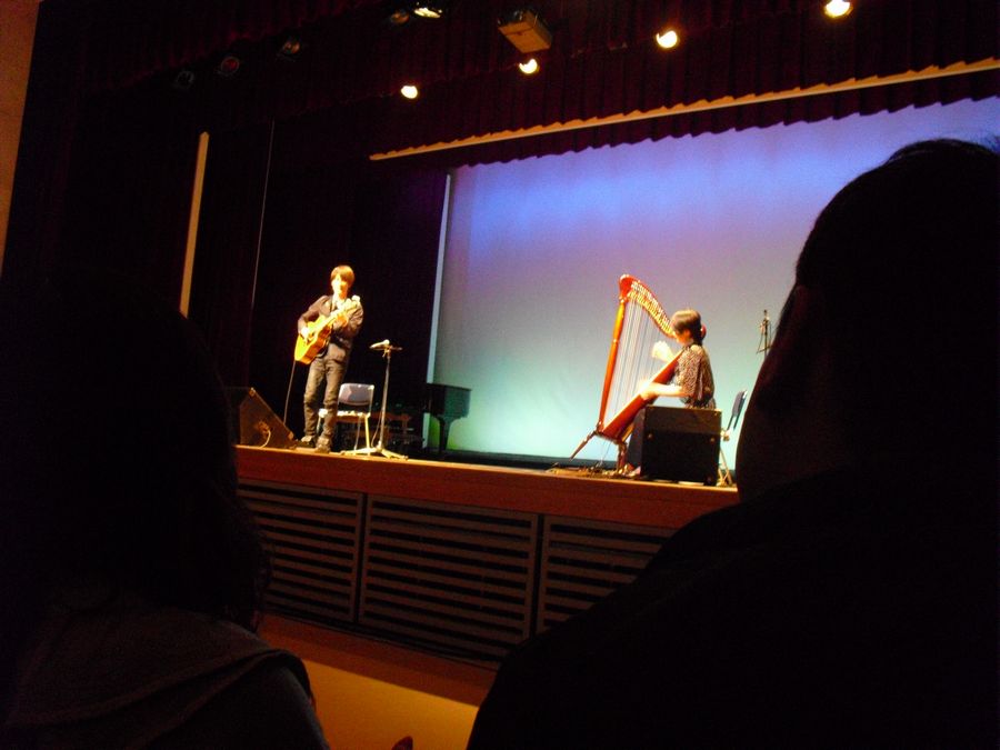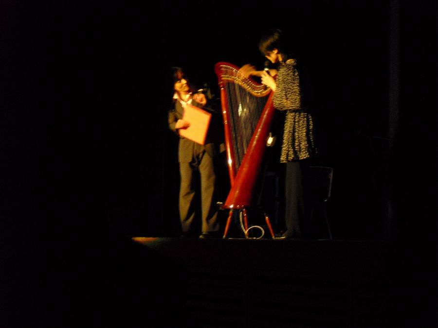 コンサートは地元の「熊野吹奏楽団」「フリーフェイス」「さらさ」そして「Mebius」が出演、良かったと思います。その中でも、あの悪音響?のなかでもギターとアイリッシュハープのデュオ「さらさ」はさすが。今までもいろいろな場所で彼らの演奏は聴いてきてますが、あらためてその存在感を見せつけられました。ギターとハープでいい掛け合いやってました。すごい!必聴もの!といっても、広島の人ならばBGMでどこかしらで聴いていることと思いますけどね。