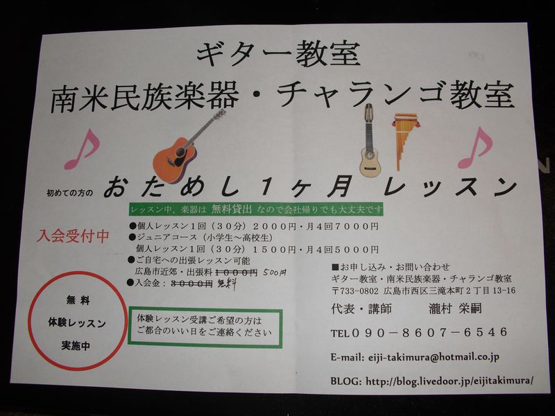 先週の土曜日(1日)、三滝の喫茶店であっちゃんが企画運営協力したコンサートが行なわれました。あっちゃんの大好きな南米音楽のコンサートで、高校生と中学生の兄妹グループの「YAMA」と日本を代表するグループ「MAYA」のメンバーの寺澤むつみさんによるユニット「YAMAYA(ヤマヤ)」の演奏会でした。「YAMAYA」というは半分冗談で、寺澤さんはサポートメンバーの役割でした。