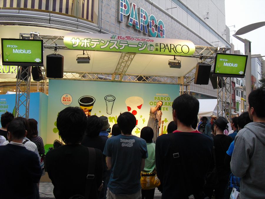 GW休みも終わって昨日(6日)からお仕事再開のラーPM。なんだか今年のGWは、あっちゃんにくっついてMebiusの追っかけ状態でした。(大汗)29日のイオンを皮切りに、フラワーフェスティバル(FF)は平和公園のメインステージ「カーネーションステージを始めとして、パルコへ行ったりカジル横川へ行ったりして3日間ともちゃんと追っかけました。おかげで休みが明けて仕事をしていても、頭の中はMebiusの歌でいっぱい状態。極めつけは明日のコンサート「東日本大震災チャリティーライブ~熊野から東北へ~」です。もう病気になりそうなラーPMです。いえ、もうなってます。ごめんなさい、Mebiusさん。(苦笑)
