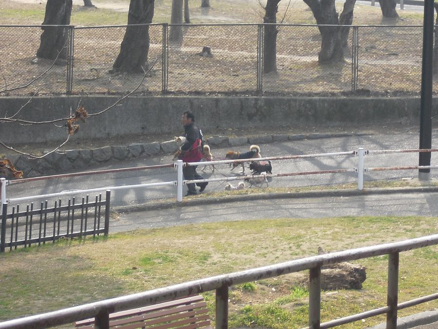今朝のラーたちのお散歩は比治山。散歩の途中でチワワを中心とした大量のワンコ(9~10匹)を発見。一定の間隔でみんなつながれているある種異様な光景に、おもわず「はぁ??なにこれ?」と声を発してしまった。ワンコたちから少し離れたところにその光景を見ているおじさんがひとり。「この人が関係してるのだろうか?」