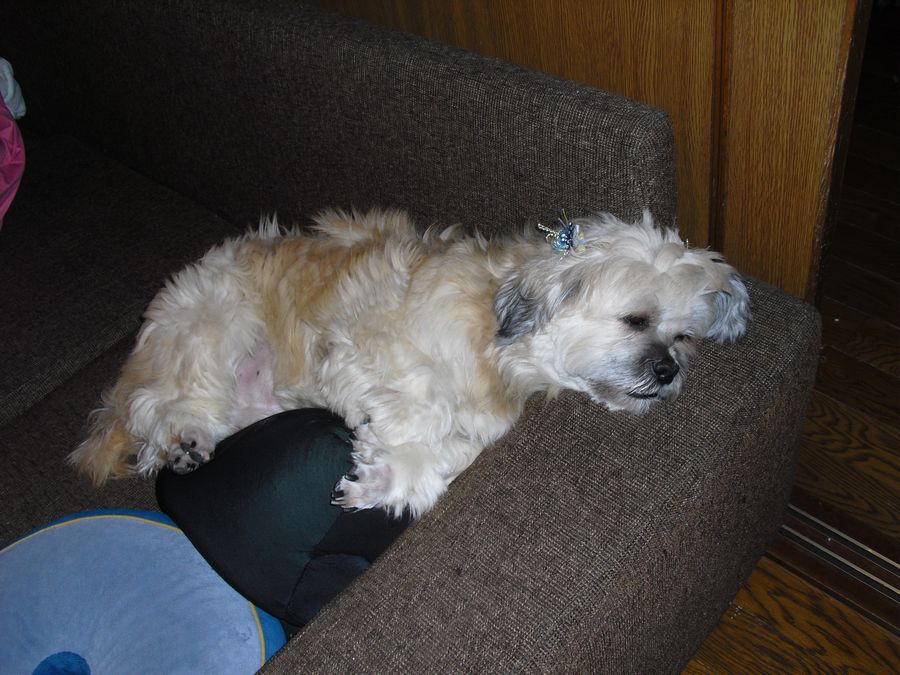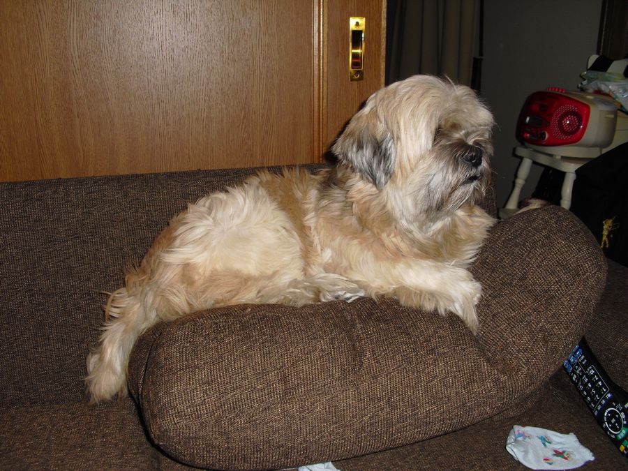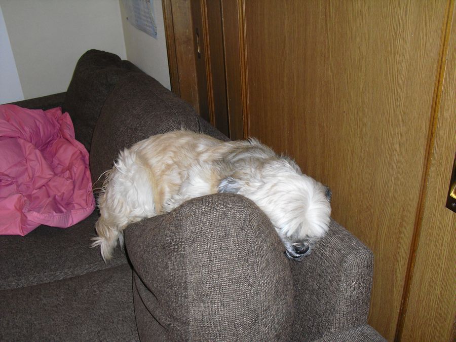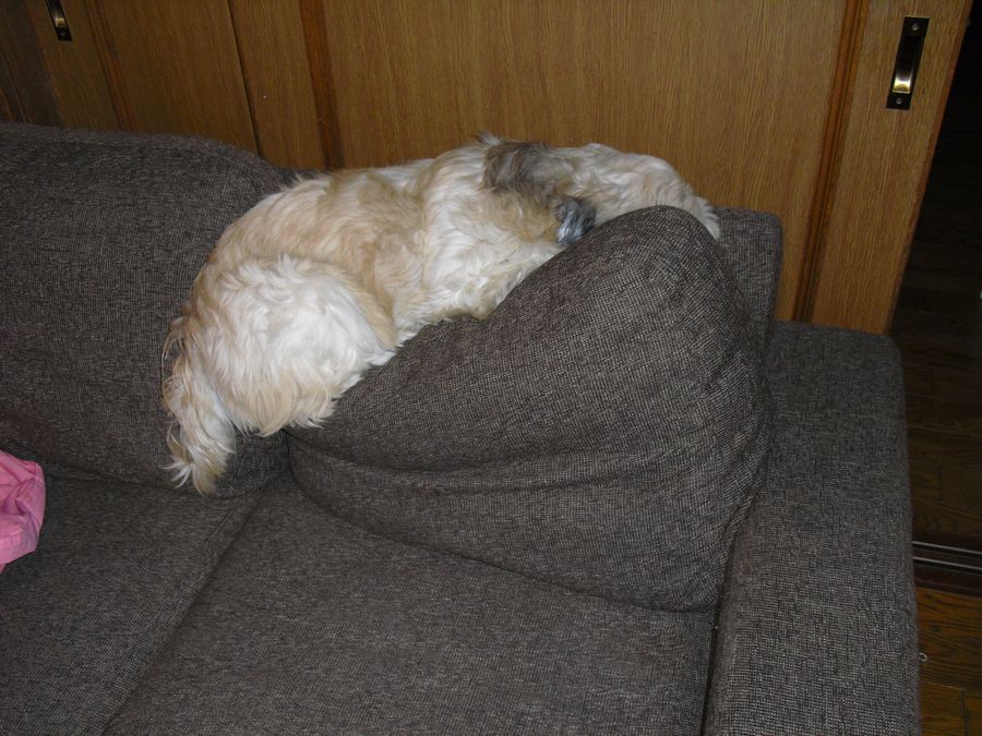 最近のラーのお気に入りの場所。ソファーの背もたれとクッションのトップ。先月お泊まりにきていたトイ・プードルのモフちゃんから逃げるために覚えた場所。今朝もここで面白い格好で寝ていたラー。(この画像はナシ)猫のサリーやマークにここを取られませんように。^^