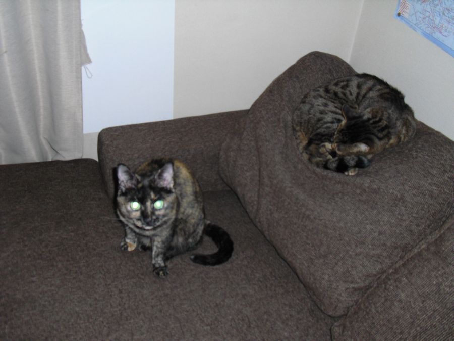 最近のラーのお気に入りの場所、ソファーの背もたれとクッションのトップ・・・しかし、ニャン族が侵略しては邪魔をする。ラーの邪魔するなー!!
