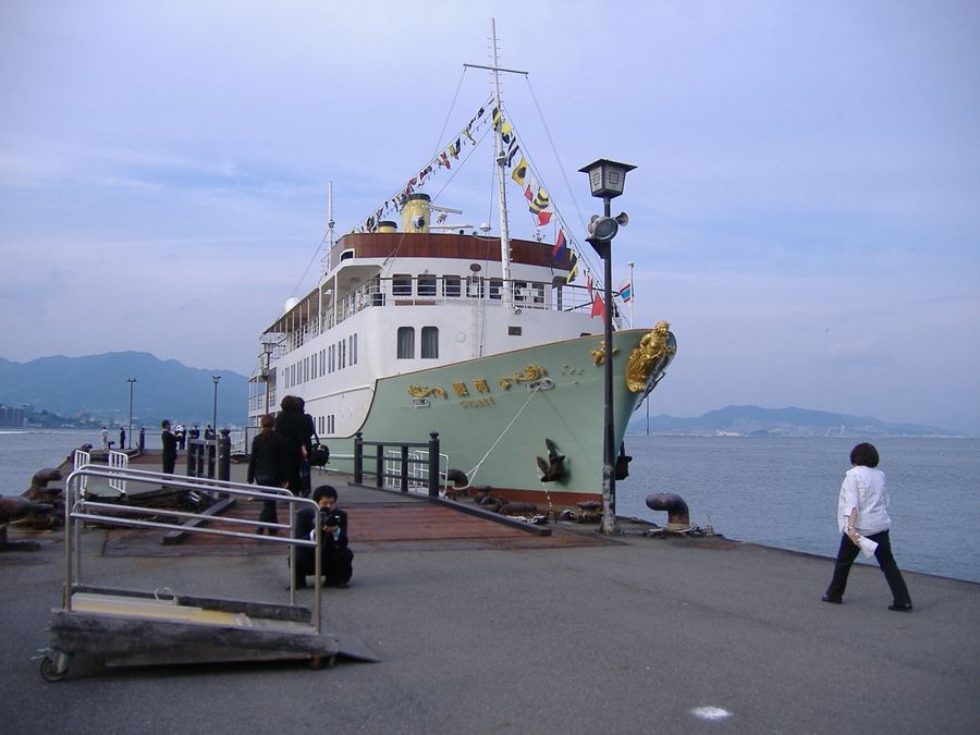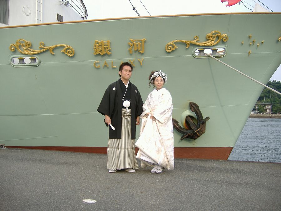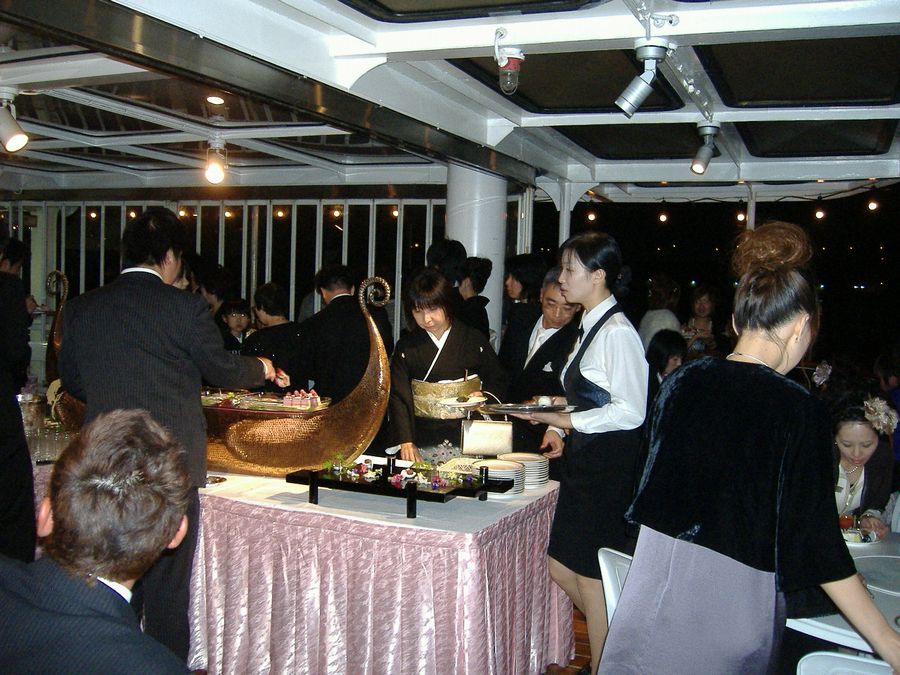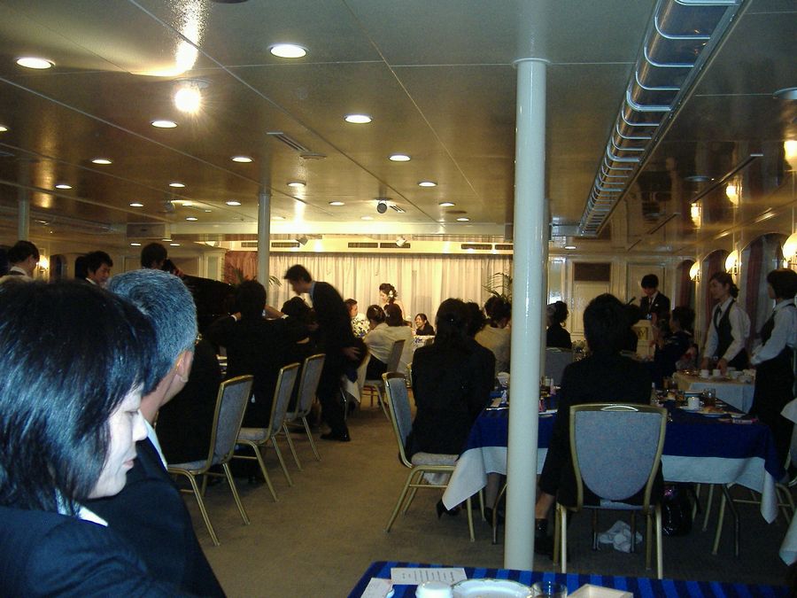披露宴は瀬戸内海汽船のクルーズ船「銀河」にて。今回の披露宴は仕事関係の方は一切お声掛けしてなく、家族、親戚、新郎新婦の友人のみでのパーティ。だから実質のお客さまといえば、まだ学生気分の若者ばかり。ワ~ワ~、ギャ~ギャ~の大騒ぎ披露宴でした。静かなひと時は、先日ご紹介したなつみの友人の姉妹デュオ「メビウス」がピアノを伴奏に歌を披露してくれたくらいだったでしょうか。それでも、若さいっぱい、明るさいっぱいの披露宴、ラーPMも肩が凝ることもなく楽しませていただき、ほとんど招待される側となっていました。(笑)