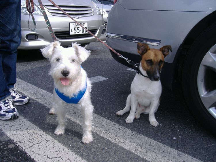 「SAにて出会ったウエスティではなくシュナウザーとジャックラッセル」