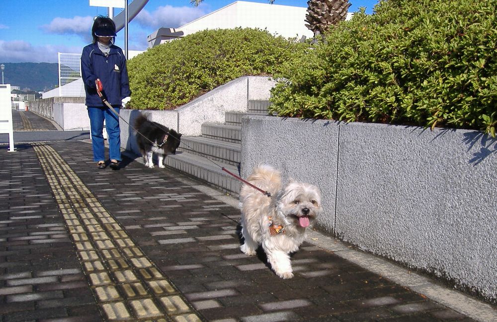昨日(14日)は雨上がりの朝、マリーナホップをお散歩のラー&ミッキー。多少雲はあるもののスッキリと晴れ渡り暖かな朝だった広島地方。半袖でもいいような暖かさでした。でも、半袖気分はラーPMだけだったかなぁ。(笑)