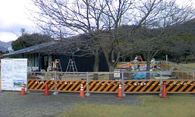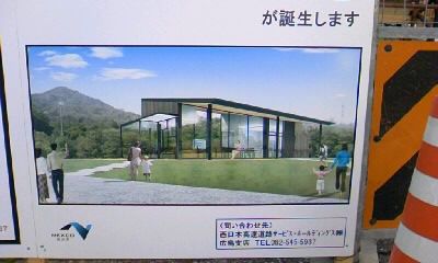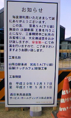 宮島SAでもうひとつの驚き。ここのSAでラサ友さんのVITくん、ぽんたちゃんと2006年にミニオフ会を行ったのですが、みんなで歩いたあの芝生エリアになんとドッグカフェが建設中でありました。(驚)最初は「また店でも作ってるんだなぁ。また何でこんな所に??」なんて簡単に思っていたのだけど、看板をよ~く見ると・・・「あっちゃ~~ん、大変じゃ~。ドッグカフェじゃ~。ドッグカフェ作っとる。」(笑)