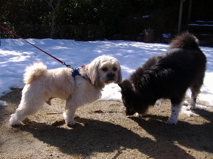 いつものようにパパさんとママさんのお二人で、ゴンちゃんとゆっくり散歩されていた。すでに散歩が終了してお疲れのラーを無理やり走らせながら、大声を出しながら近づいてくる私たちにゴンタパパ、ママさんともにとても驚かれ、少し引いていらっしゃった。驚かせてすみませんでした。思わぬ偶然につい興奮してしまって。(笑)