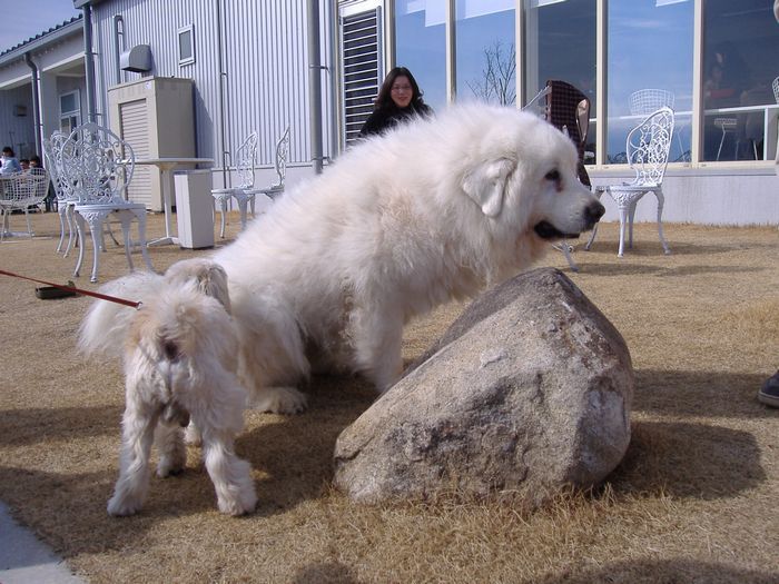飼い主さんとお話していたところ「この子、足が1本無いんです。腫瘍で・・・」と言われ、初めて気が付いた。前足を隠して伏せしているのかと思っていた。大きな体のピレネー犬、ラーどころかラーPMより大きい。別れ際にラーと対面させてみると、パトちゃん興奮して立ち上がった。自力で立ち上がり歩き出す姿、凄いけどやはり見ていると痛々しく辛い。ご主人の休日でないと、お散歩にも連れてでられないご様子。超大型犬ゆえにご家族もパトちゃんも大変だよね。しかし、ご家族の愛情をたっぷり受けている様子とがんばっているパトちゃんの姿に心暖かくしていただいた。また、お会いしましょうパトちゃん。^^