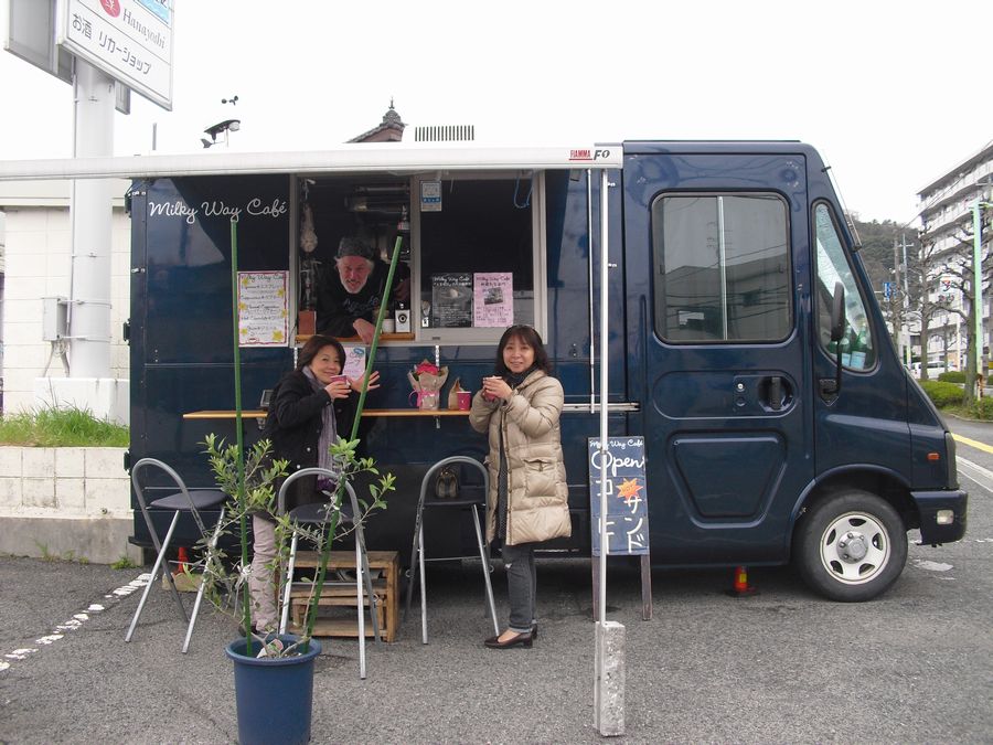 次は「ミルキーウェイ・カフェ」・・・素敵な移動販売店です。あっちゃんのお友だち「HIさん」から紹介を受けた「ティムさん」のお店。先週の土曜日にお伺いしたのですが、山が白く真冬並みの寒さで大変でした。オープンカフェは悪天が一番辛いですよね。