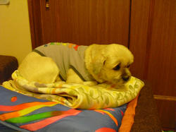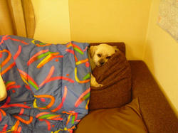 昨日の朝のラーの姿・・・寒いので布団(これ寝袋ですが)を掛けてお気に入りの場所でお休みになっていました。ワンコが布団を掛けて寝る時代。昔では考えられないなぁ。布団も掛けられないで寝ている人も世の中たくさんいるのに。複雑・・・。