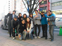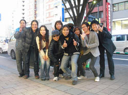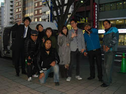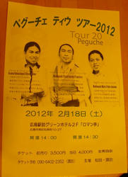 看板が付いた同じ日にあった「ペグーチェ・ティウ」のライブコンサート。広島駅前グリーンホテルにて70名弱のお客様の熱気で大盛況でした。都合上、コンサート風景の写真はありませんが、終了後大阪へ出発する直前に最後まで残ってくれたスタッフとともに記念集合写真をパチリ・パチリ・パチリ。