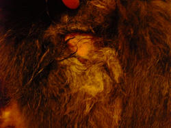 1日(木)の夜、ラーとミッキーを散歩に連れていこうとしたところ、ミッキーがいつものように喜ばない。何だか様子が変。左後ろのお尻近くを噛んだり舐めたり。そして痛がるようにクンクン泣いたり。ミッキーが気にする所を見ようとして触ると歯を剝いて嫌がり、どうしても見せてくれない。「何か悪いものができたのか??」と思ったのですが、仕方ないので一晩様子を見ました。そして、昨日(2日)の夜、仕事から帰ってから、ミッキーのご機嫌を伺いながら気になるところをそ~っと見てみると・・・大変だぁ~毛が無い!ハゲてる!どうしたミッキー!