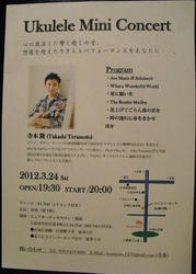 今月の24日(土)、あっちゃんがお手伝いするライブ演奏会が開催されます。今回はウクレレのコンサート。演奏者は寺本隆さん。昨年12月23日に彼のコンサートを観て感動!ウクレレを軽く見てました。興味のある方はチラシをご覧下さい。楽しみだなぁ~。