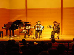本日21日(土)、あっちゃんは東区民文化センターのステージに立ちました。最近、結成したばかりの急造ユニット3人組で。ラーPMは用事があったため遅れて駆けつけてみると、最後の一曲を演奏中でぎりぎりセーフ。
