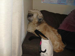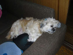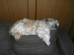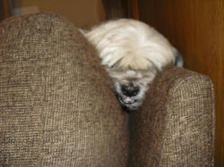 最近のラーのお気に入りの場所。ソファーの背もたれとクッションのトップ。先月お泊まりにきていたトイ・プードルのモフちゃんから逃げるために覚えた場所。今朝もここで面白い格好で寝ていたラー。(この画像はナシ)猫のサリーやマークにここを取られませんように。^^