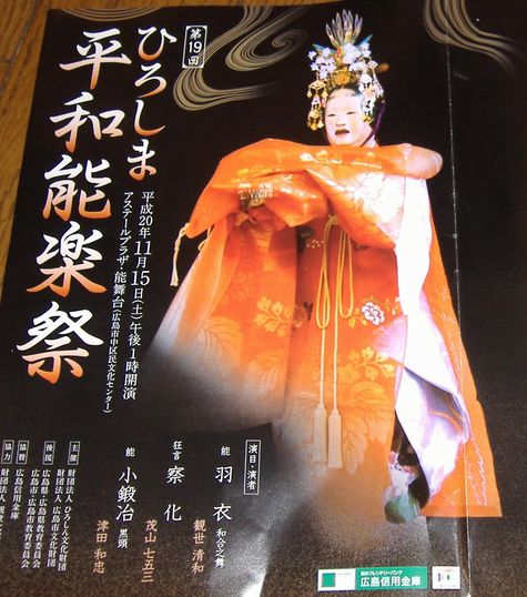 本日15日、毎年金融機関さんよりご招待いただいている「ひろしま平和能楽祭」へあっちゃんと観賞してきました。本来ならばラーPMの父と母が出席すべき能楽祭だけど、昨年に引き続き父は入院しているし、母といえば昨年にくらべずいぶんと認知症が進行してきたので今年はもう無理な状態・・・残念ながらラーPM夫婦の出番。いつまでも父母に行ってもらいたいのだが。父ほど能楽に精通してはいませんが、それなりに楽しんできたラーPMでした。あっちゃんはといえば・・・「どこが面白いの??」(大汗)仕方ないです、彼女は中南米音楽にどっぷり浸かっていますから。おまけに始めたばかりなので、他の音楽や舞台はまったく見えておりませんから。(苦笑)